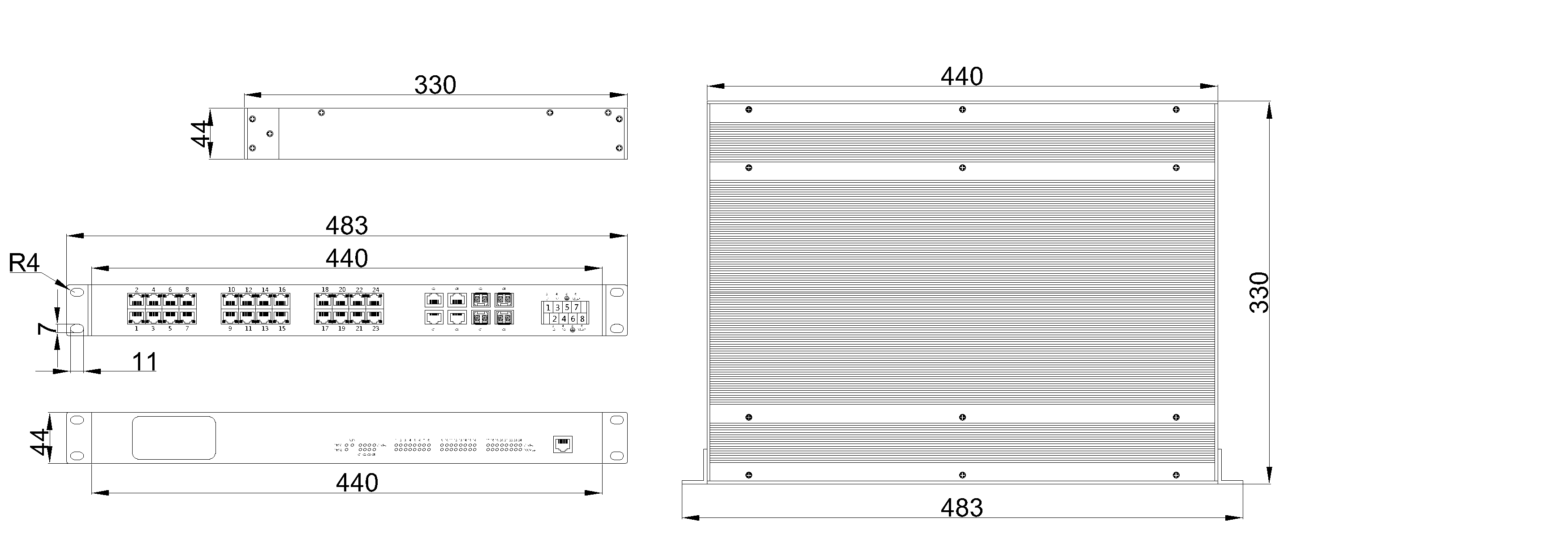 標準19英寸機架式安裝,483mm×44mm×330mm,支持前后出線安裝
